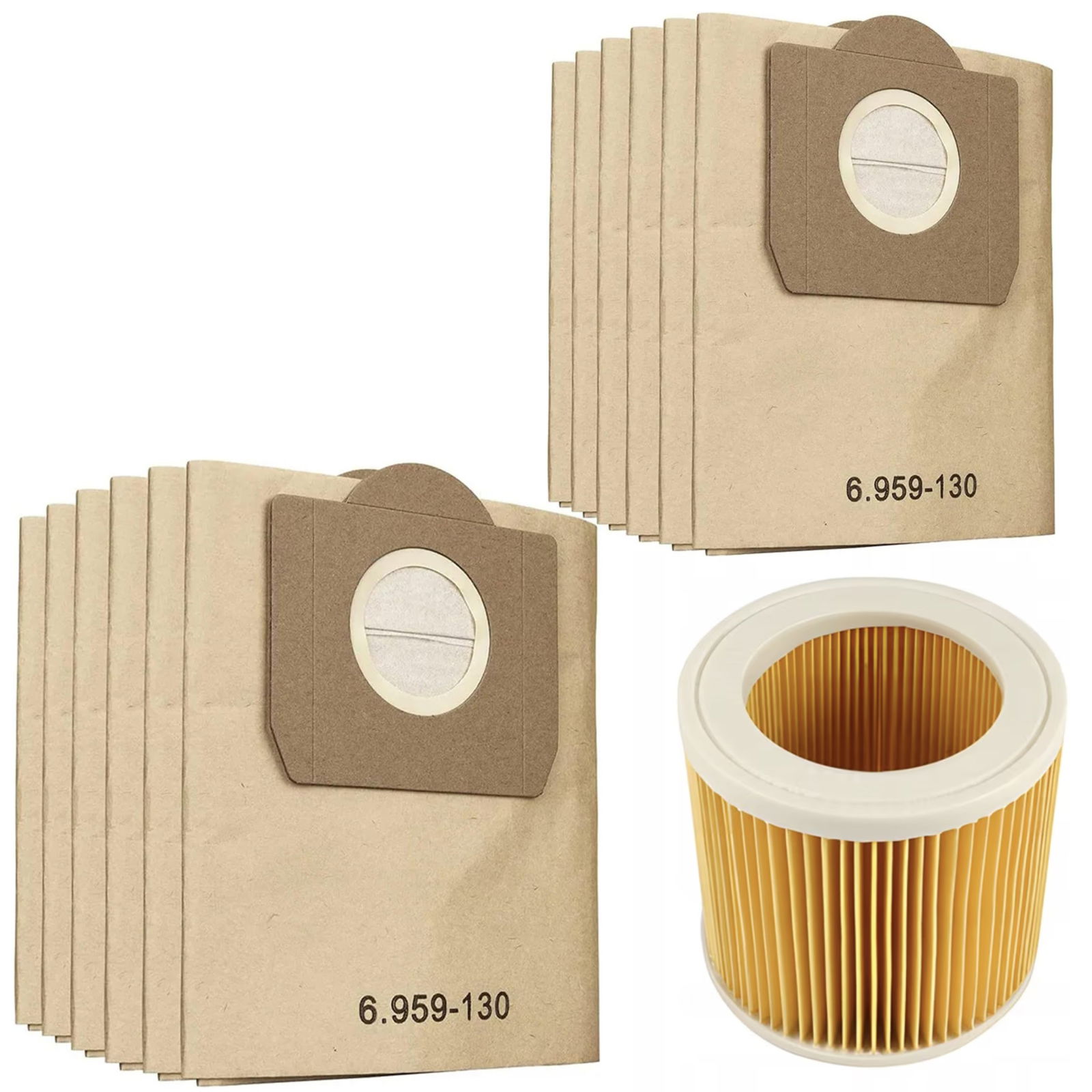 Set 10 saci compatibili cu aspiratoarele KARCHER WD 3, SE 4001, MV3 + 1 filtru de aer – hartie cu dublu strat filtrant, cod 6.959-130.0