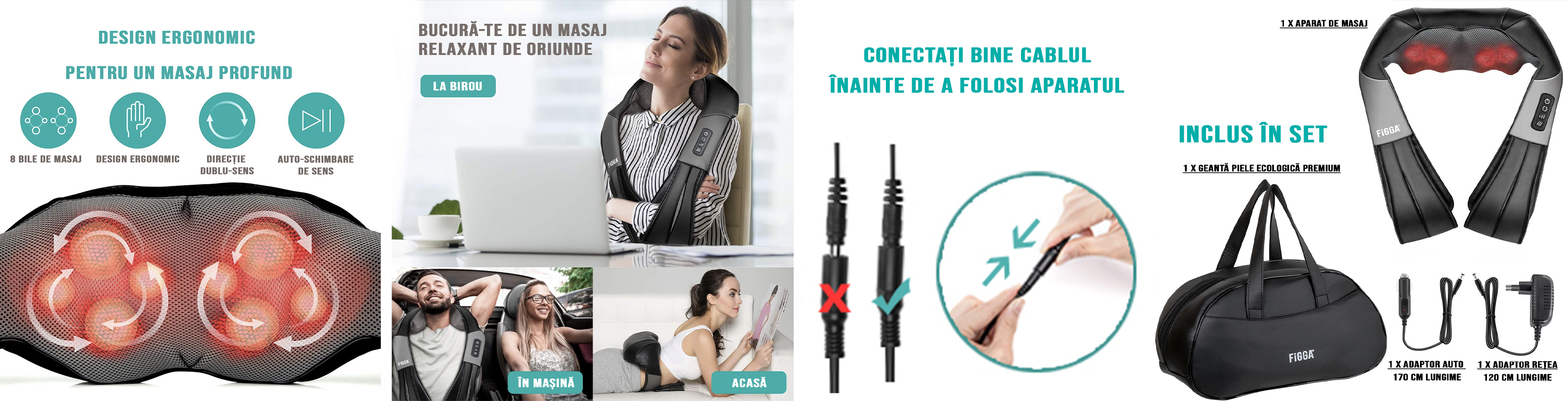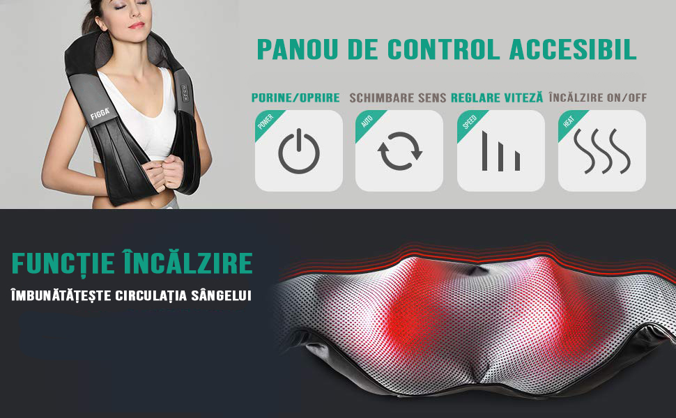 Aparat profesional masaj electric FiGGA® pentru gat si spate, cu incalzire, cervical, lombar, abdomen si picioare, miscari 3D, relaxare musculara, utilizare acasa, la birou si in masina
