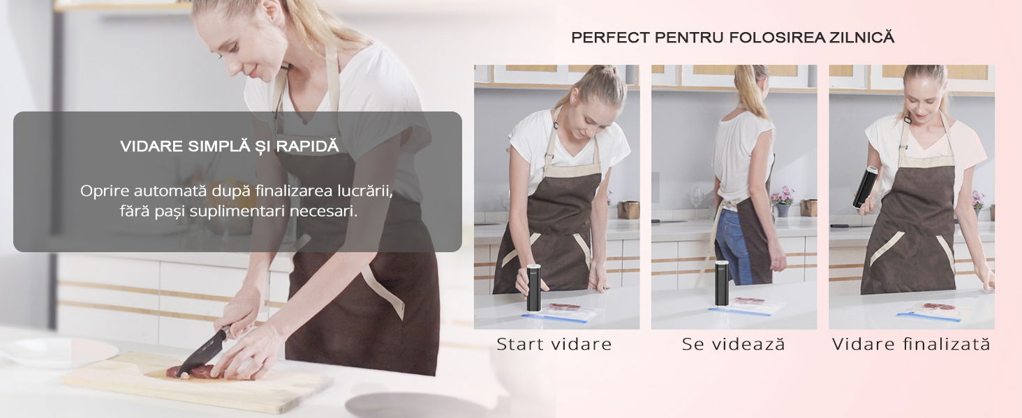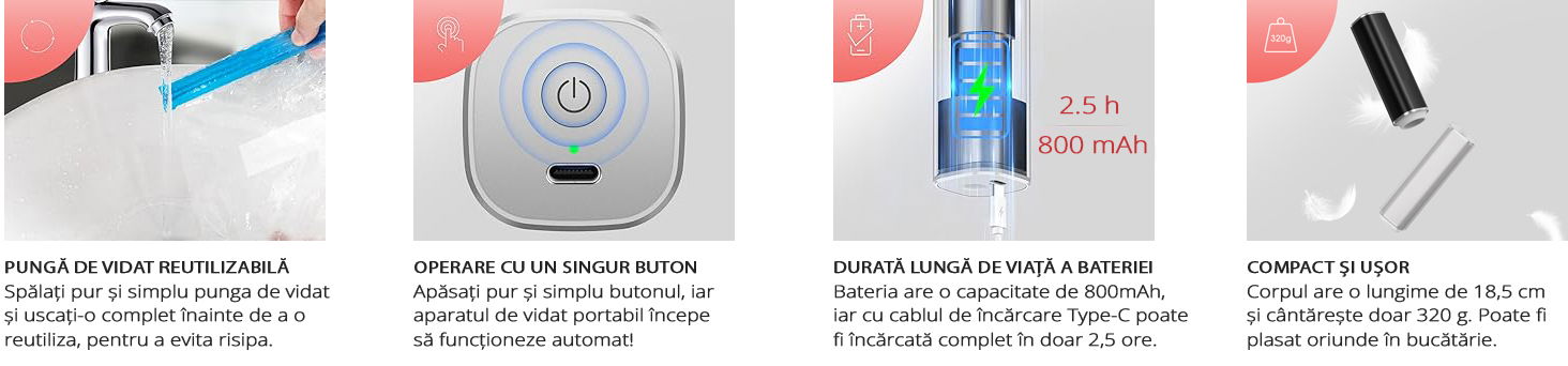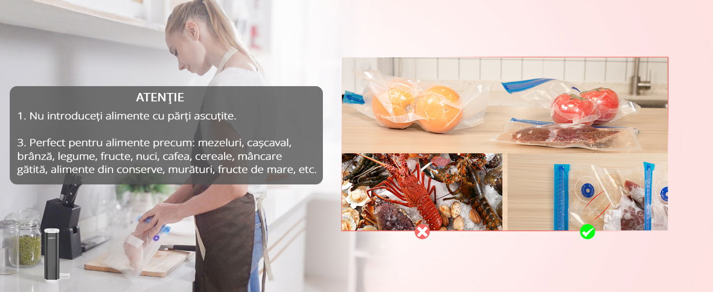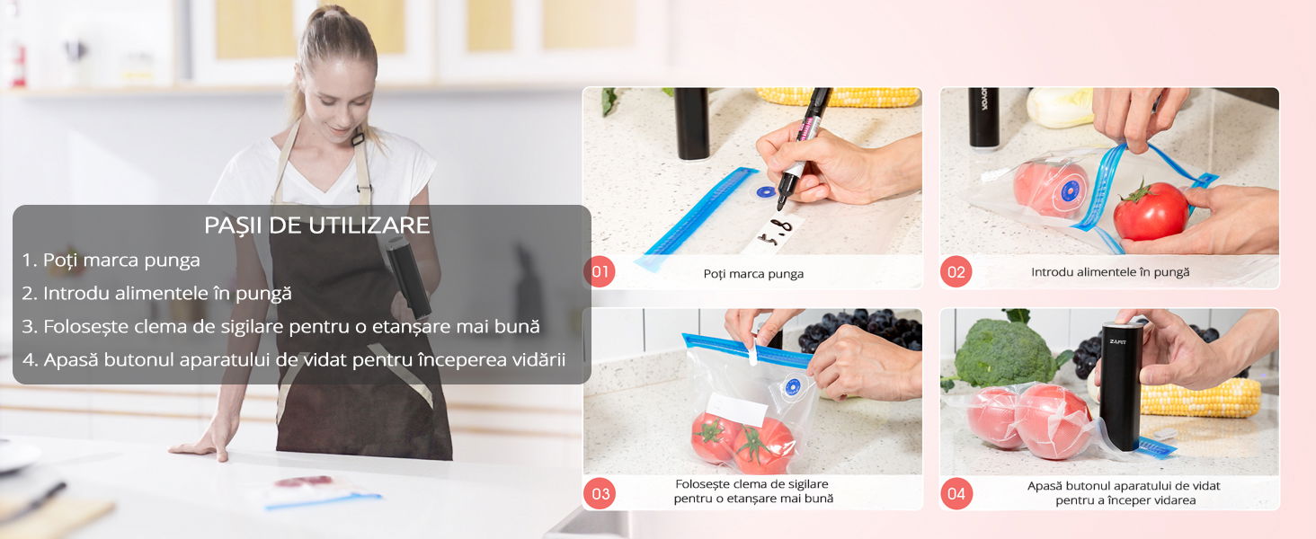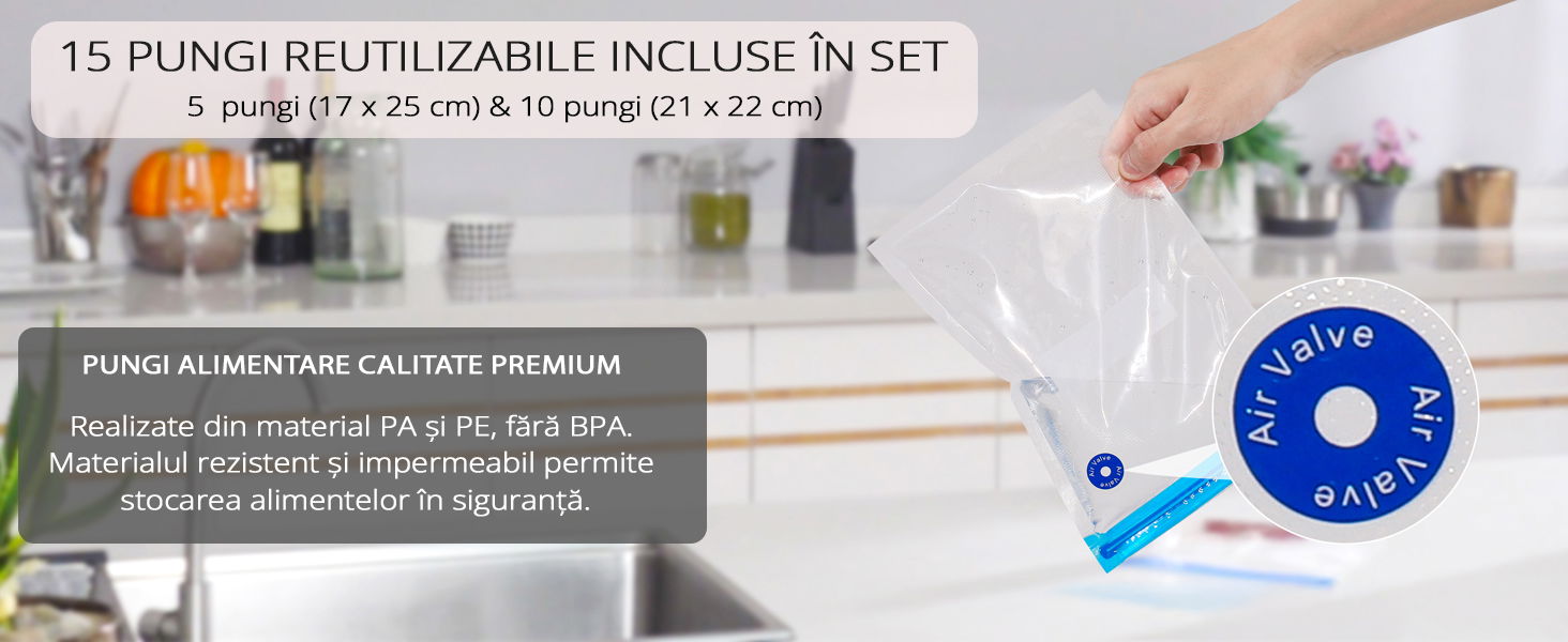 Pachetul include 15 pungi de vidat reutilizabile, realizate din materiale de calitate alimentara, sigure pentru depozitarea alimentelor. Designul impermeabil al pungilor permite reutilizarea acestora dupa spalare.