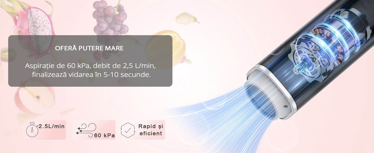 Echipat cu un motor puternic, PMP-01 genereaza o presiune de pana la 60 kPa, oferind o viteza de vidare impresionanta de 2,5 L/min. Finalizeaza procesul de vidare in doar 5-10 secunde, economisind timp si energie.