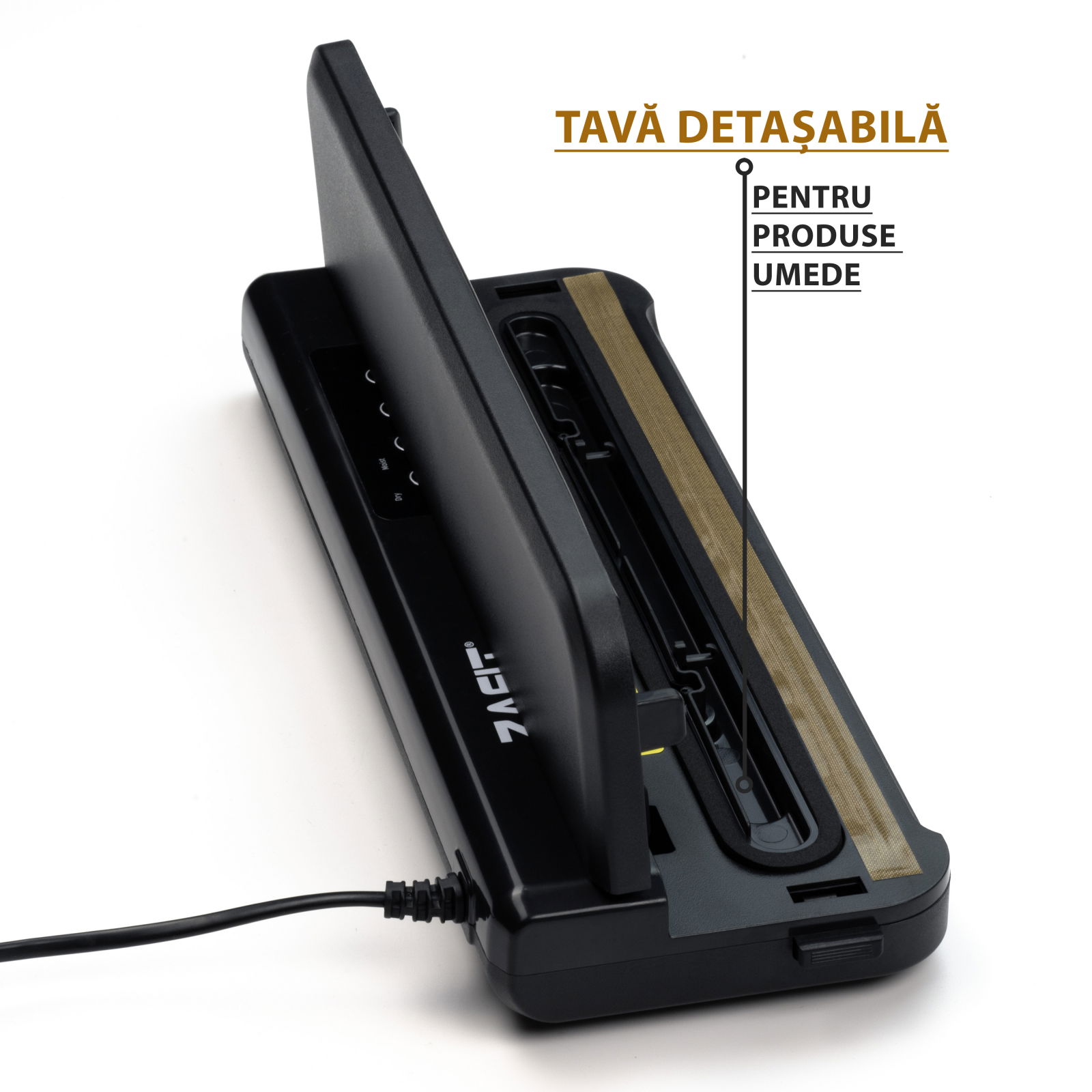 Îmi place, de asemenea, ca are o tăviță unde se aduna apa, când videaza alimente umede, astfel ca, după ce termina de vidat, doar se clateste tăvita și nu ai de curățat tot interiorul aparatului.