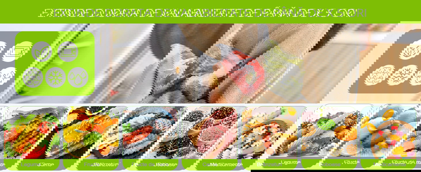 Alege pachetul ZAFIT™ cu 100 saci de vidat (20 cm x 30 cm), cu care poti sa videzi, sigilezi si resigilezi carne, legume, peste sau multe alte alimente.