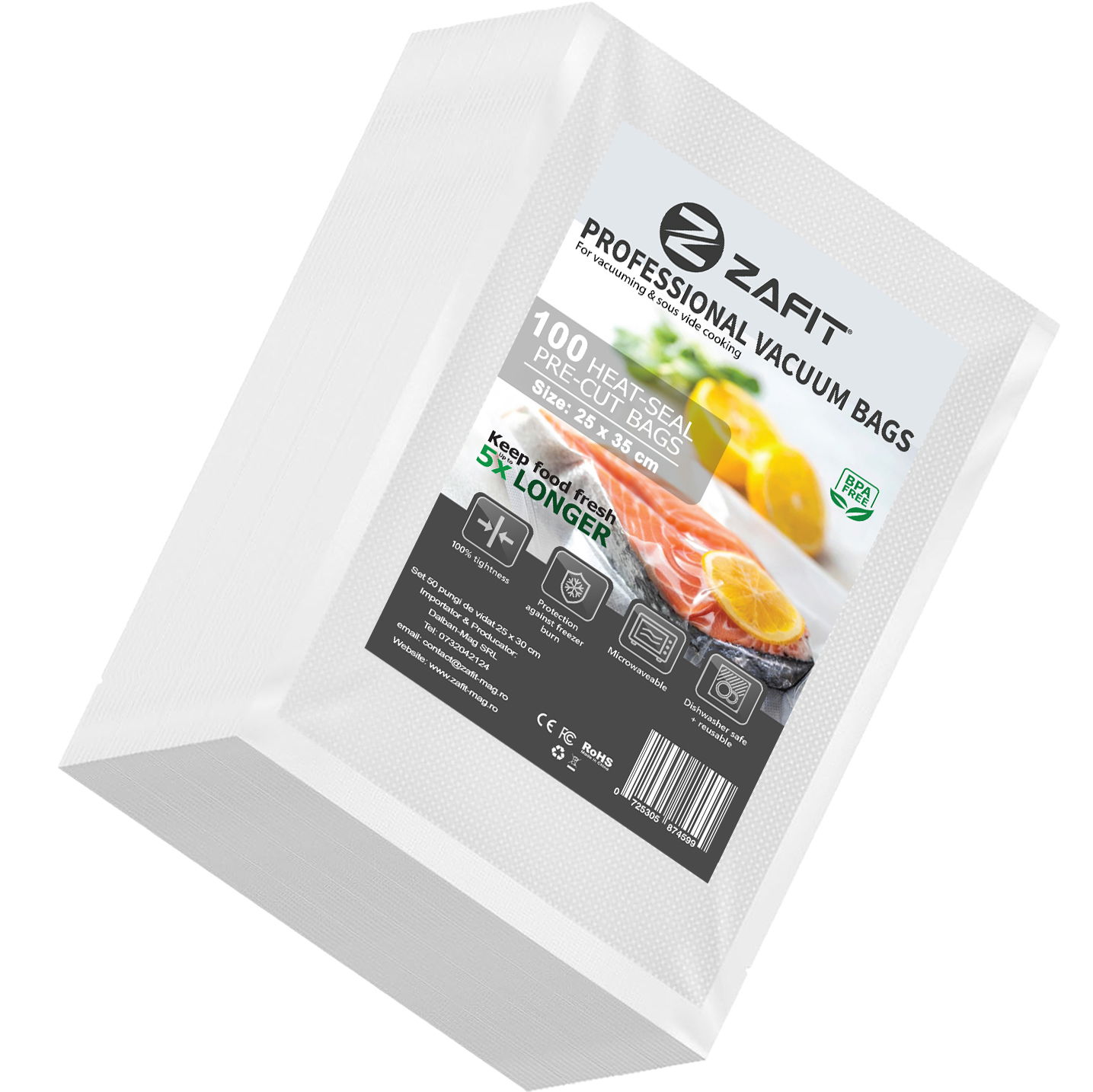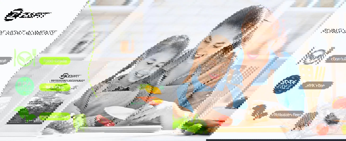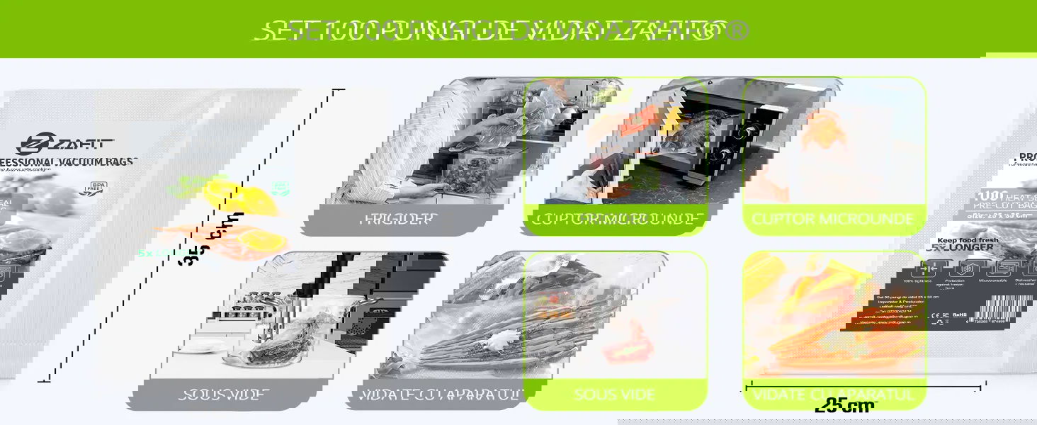 Alege pachetul ZAFIT™ cu 100 saci de vidat (25 cm x 35 cm), cu care poti sa videzi, sigilezi si resigilezi carne, legume, peste sau multe alte alimente.