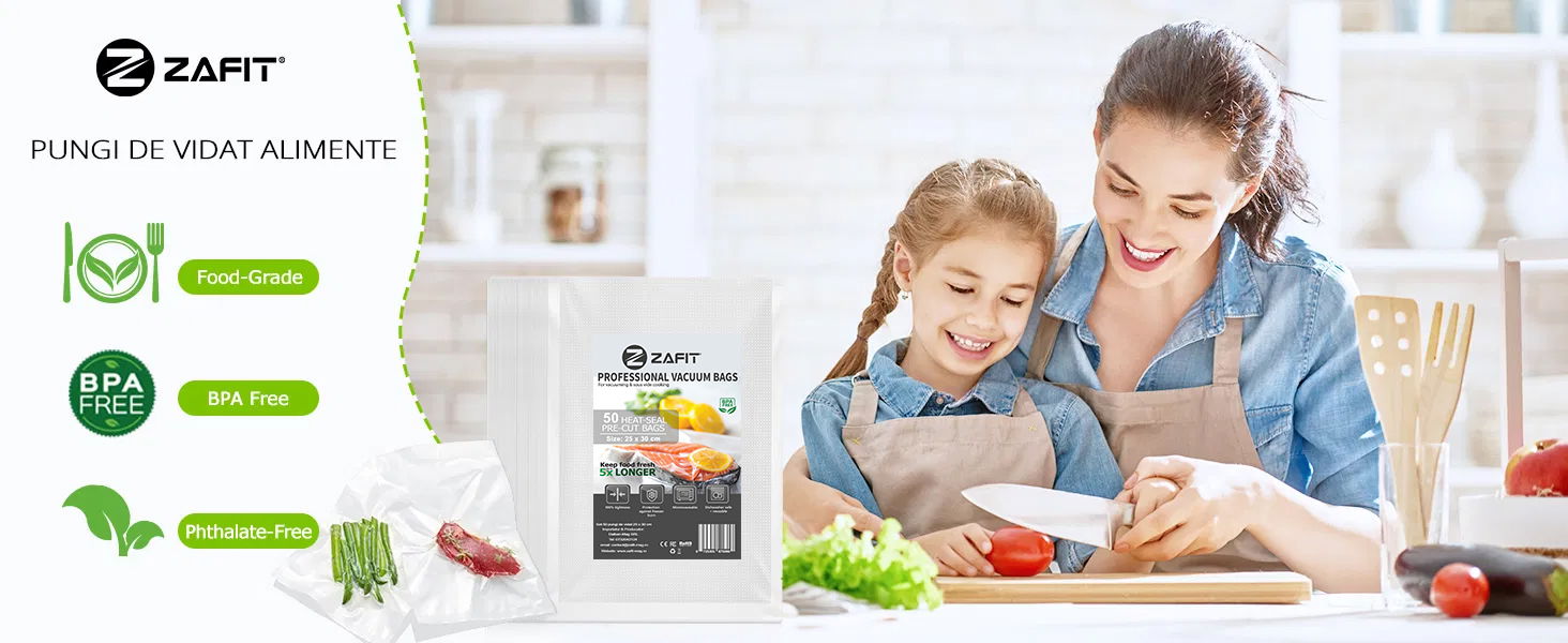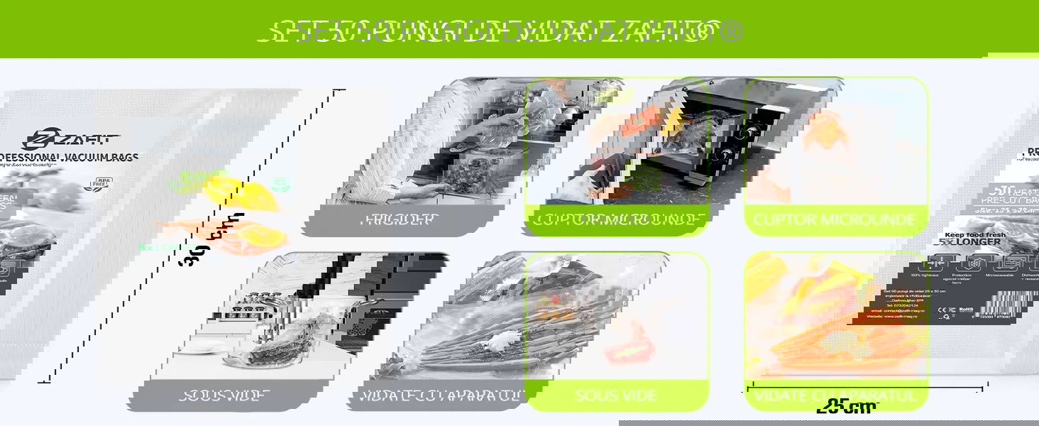 Alege pachetul ZAFIT™ cu 50 saci de vidat (25 cm x 30 cm), cu care poti sa videzi, sigilezi si resigilezi carne, legume, peste sau multe alte alimente.