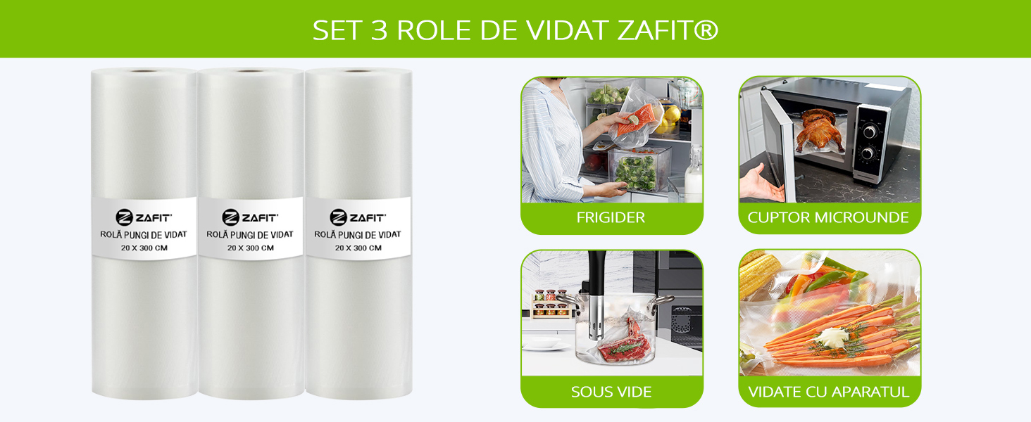 Prin utilizarea vidarii, aerul si umezeala nu patrund in alimente, iar nutrientii, gustul si prospetimea se mentin de pana la cinci ori mai mult decat metodele traditionale de depozitare. In plus, cu pungile de vidat ZAFIT™, previi arsurile din congelator.