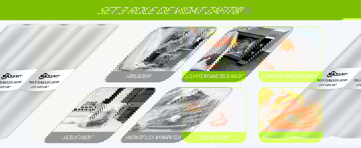 Alege Set 3 role pungi de vidat gofrate ZAFIT™, 20 x 300 cm, pentru aparat de vidat alimente, reutilizabile, rezistente, sous vide, lavabile in masina de spalat, fara BPA, transparent, cu care poti sa videzi, sigilezi si resigilezi carne, legume, peste sau multe alte alimente.