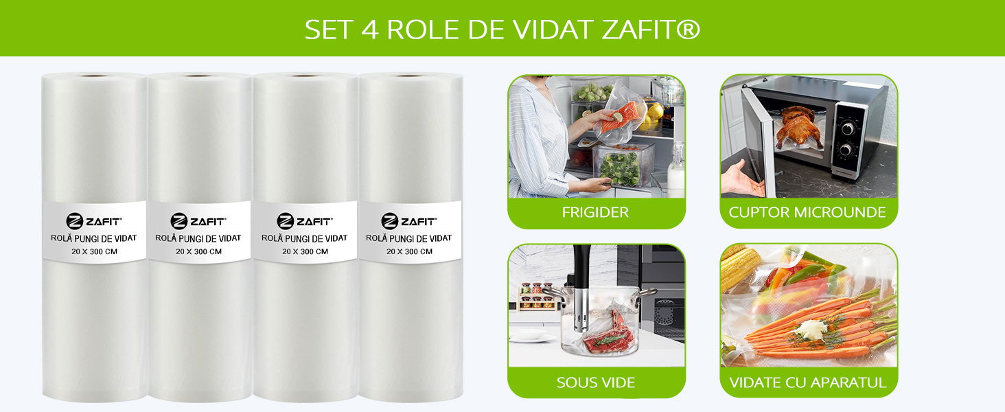Prin utilizarea vidarii, aerul si umezeala nu patrund in alimente, iar nutrientii, gustul si prospetimea se mentin de pana la cinci ori mai mult decat metodele traditionale de depozitare. In plus, cu pungile de vidat ZAFIT™, previi arsurile din congelator.