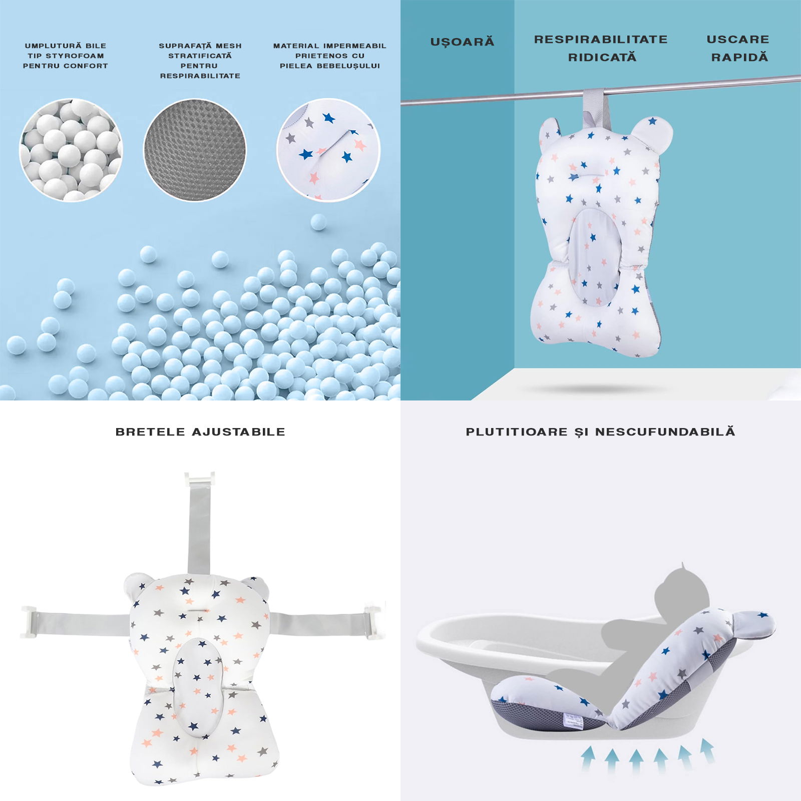 Cadita bebe cu suport FiGGA®, 0-48 luni, pliabila, termometru, picioare antiderapante, cana pentru clatire tip jucarie, suport cap de dus, suport pentru sapun, Albastru