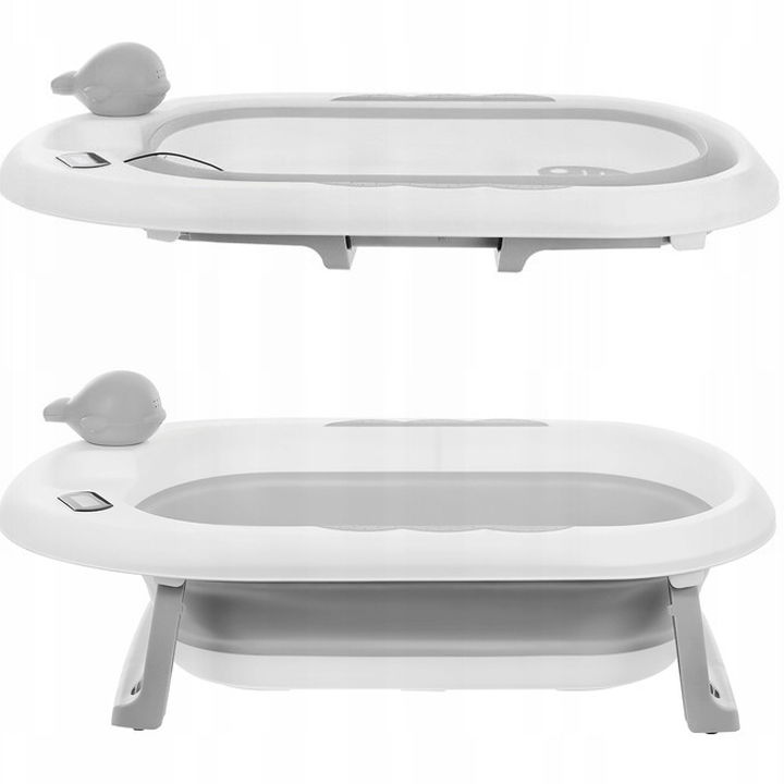 FIGGA Cadita bebe cu suport FiGGA®, 0-48 luni, pliabila, termometru, picioare antiderapante, cana pentru clatire tip jucarie, suport cap de dus, suport pentru sapun, Gri