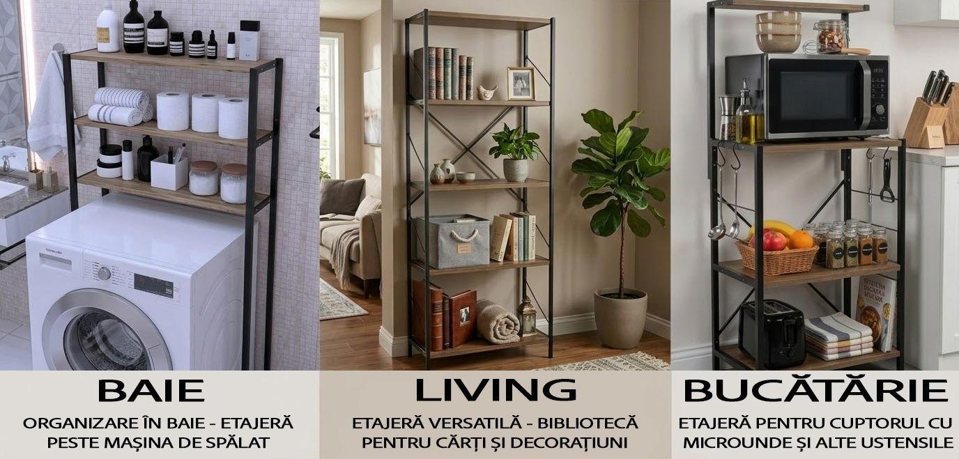 Baie si spalatorie: Spatiile mici necesita solutii inteligente. O etajera baie te ajuta sa pastrezi la indemana prosoapele si produsele cosmetice. Pentru un plus de eficienta, alege un model care se poate monta deasupra la masina de spalat, optimizand la maximum spatiul vertical.