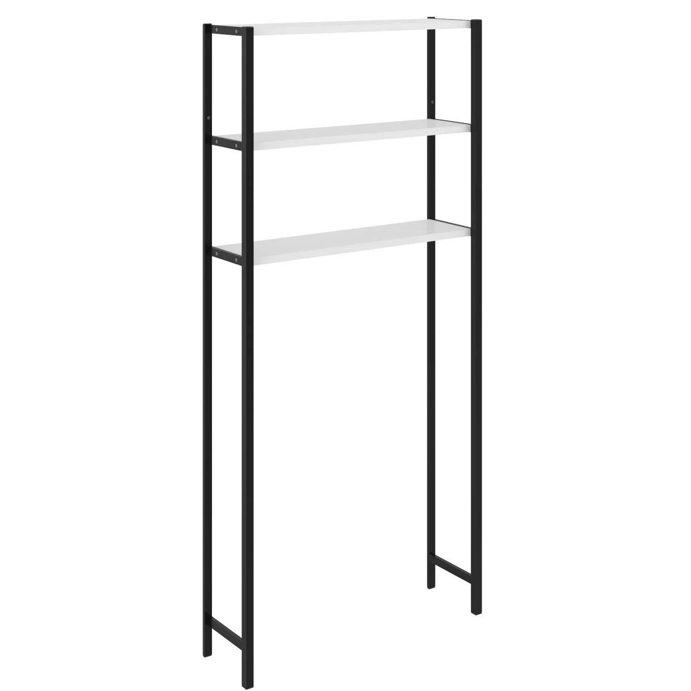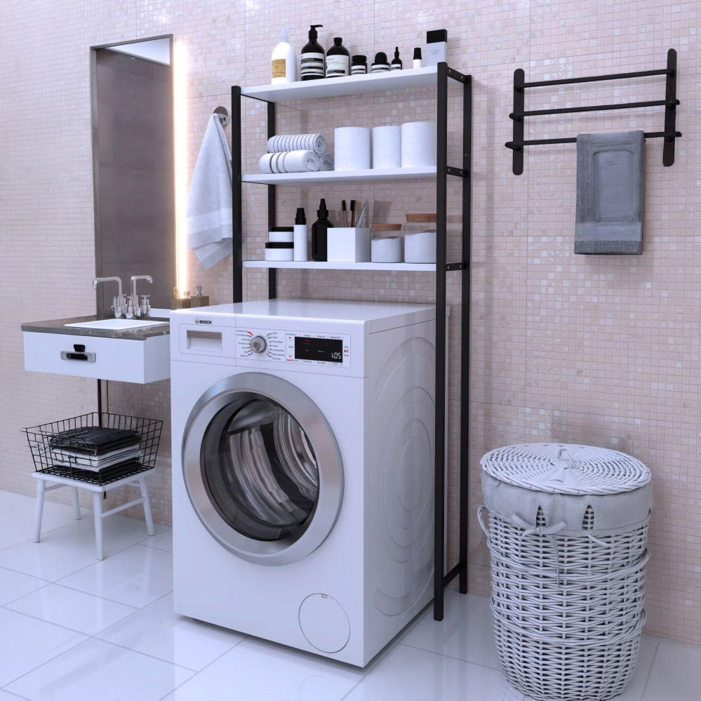 Etajera pentru Masina de Spalat cu 3 polite, 150cm x 69cm x 20cm, Metal + MDF, Organizator Multifunctional pentru Baie, Spatii Inguste, Ideal pentru prosoape sau produse de igiena, Negru/Alb