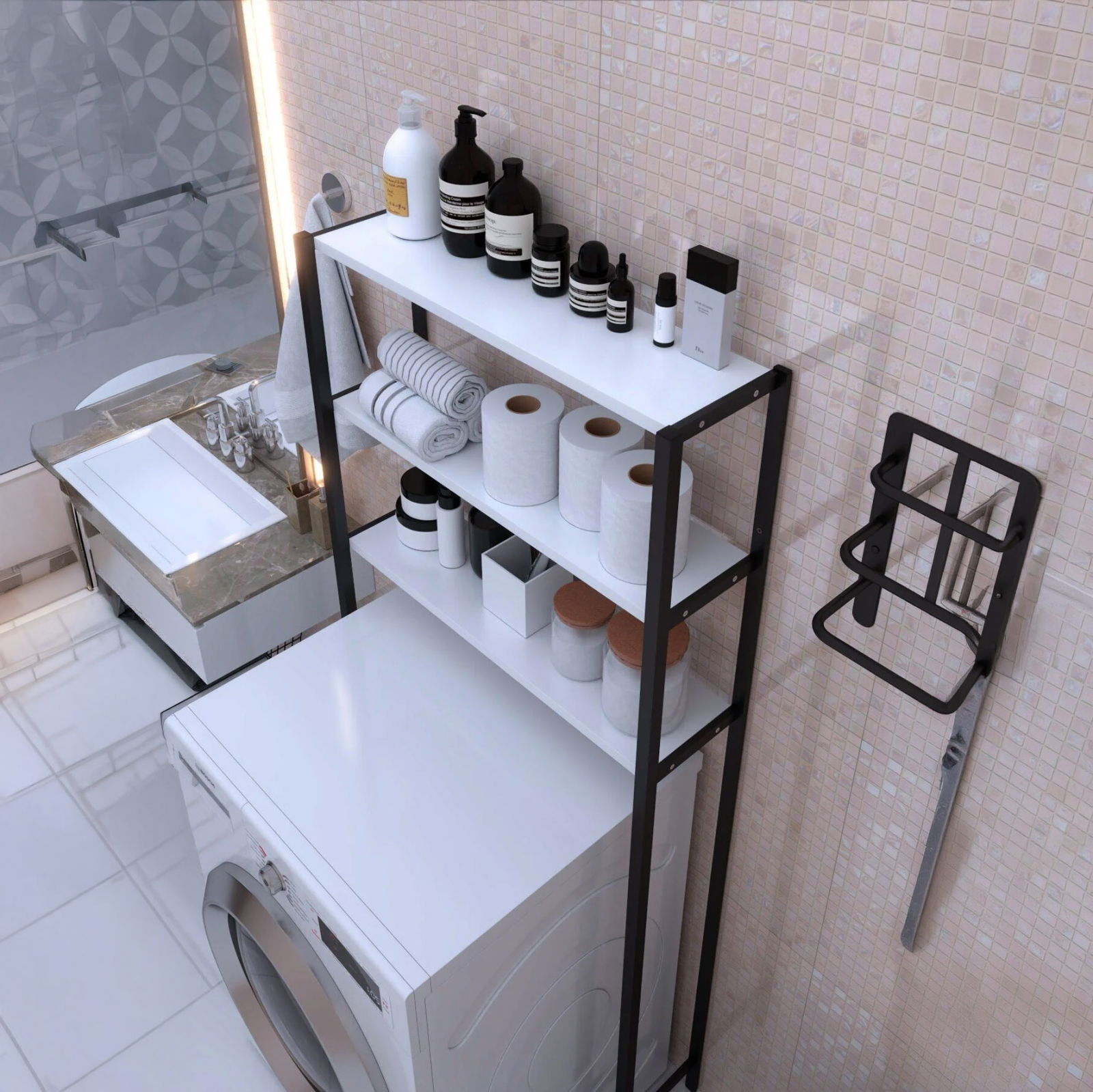 Transforma fiecare centimetru din baia ta intr-un spatiu complet functional si extrem de atragator. Daca te confrunti cu lipsa spatiului in baie sau in zona de spalatorie, aceasta etajera supraetajata este solutia definitiva. Proiectata strategic pentru a folosi spatiul "mort" de deasupra masinii de spalat sau a toaletei, acest organizator aduce un plus de confort si un aer modern, de inspiratie industriala, in locuinta ta.