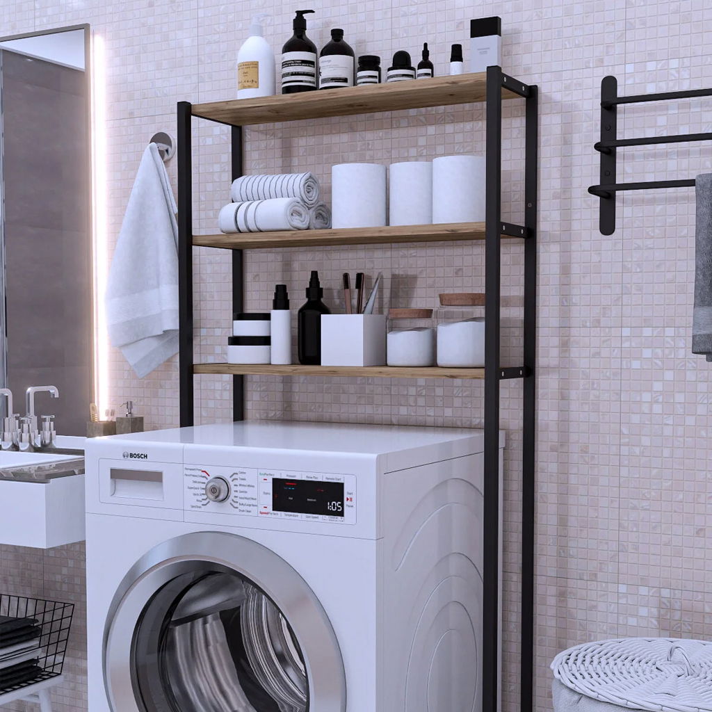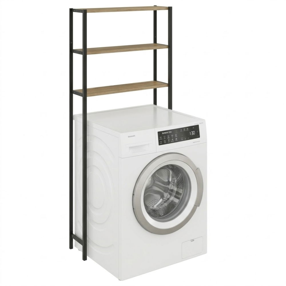 Etajera pentru Masina de Spalat cu 3 polite, 150cm x 69cm x 20cm, Metal + MDF, Organizator Multifunctional pentru Baie, Spatii Inguste, Ideal pentru prosoape sau produse de igiena, Negru/Lemn