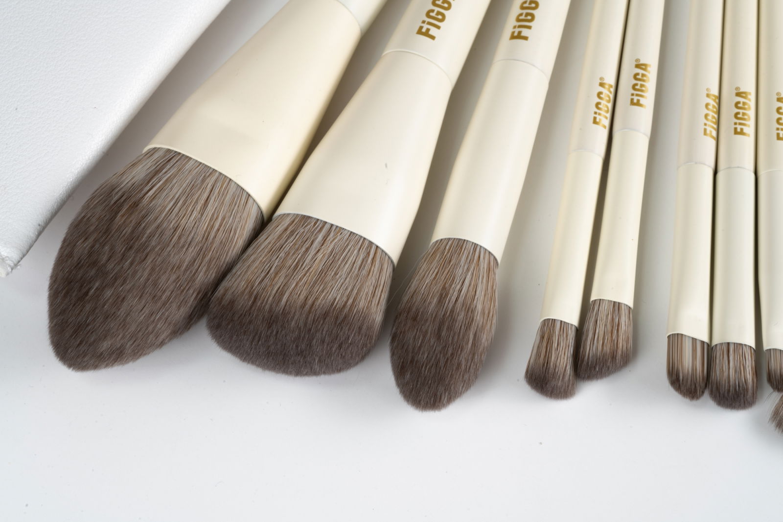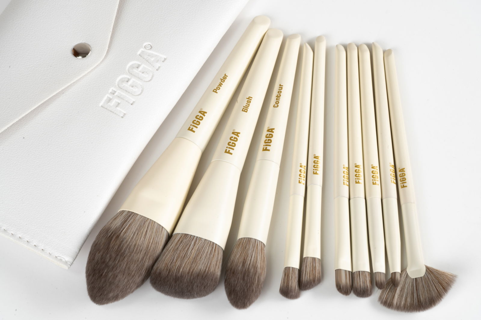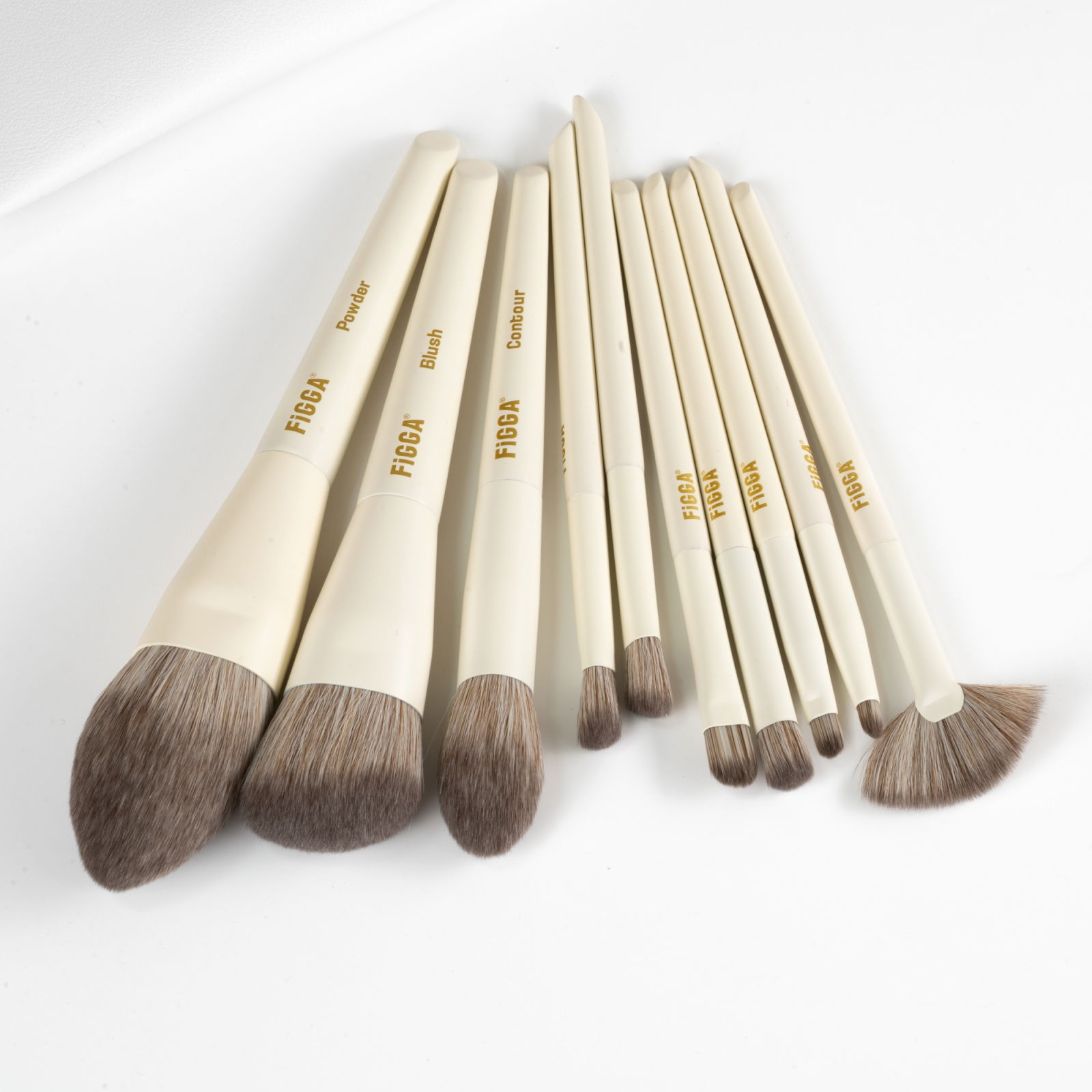 FIGGA Set 10 pensule machiaj FiGGA®, Profesionale, manere din lemn si aluminiu, gentuta depozitare, Alb crem